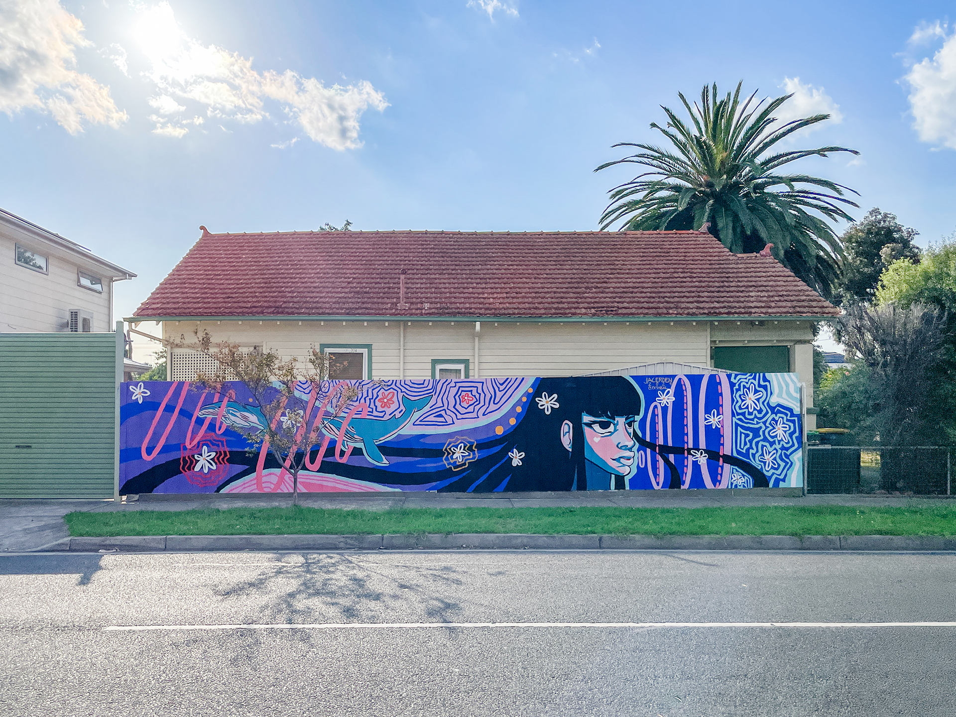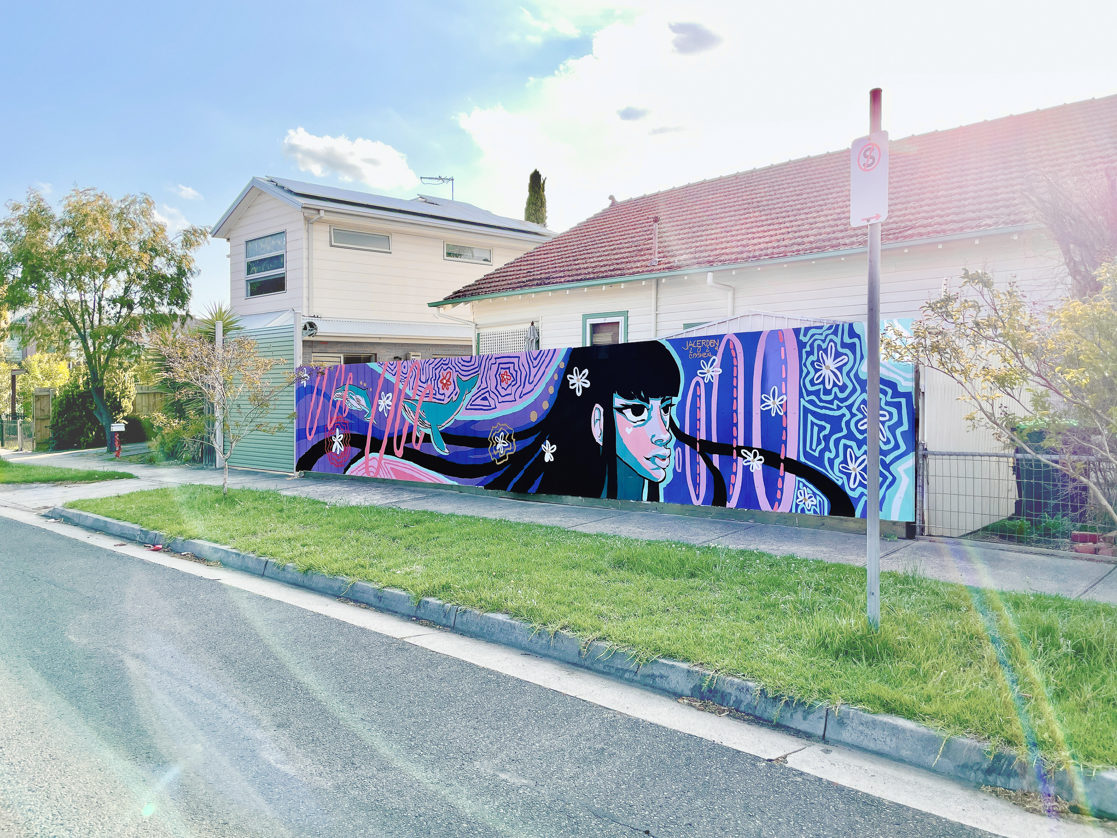 Painting this mural in Coburg, Naarm, gave me the chance to share something meaningful with the local community. Beside a park, it is easily accessible, especially to kids who light up at the bright colours and playful whales. I enjoyed working on the piece and connecting with people who stopped by to express their appreciation. These conversations made the experience even more special.